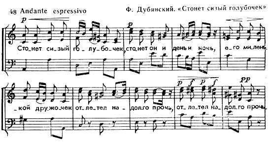 Кантовая фактура с характерным для нее терцовым или секстовым параллельным движением верхних голосов нередко выступает в ранних "российских песнях". Один из примеров - широко известная песня "Стонет сизый голубочек" Ф. М. Дубянского:
